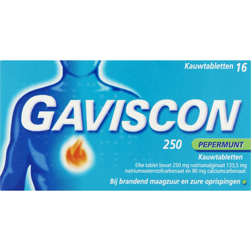 null Wij adviseren jou alleen tot aanschaf en gebruik van dit zelfzorgmedicijn over te gaan als jij goed geïnformeerd bent. Lees vooraf de bijsluiter van de fabrikant, zoals goedgekeurd door het College ter Beoordeling van Geneesmiddelen (CBG). De informatie op ah.nl vervangt niet het individuele advies van arts, apotheker of drogist. AH biedt verwijzingen, zoals naar het CBG, als service aan. AH is niet verantwoordelijk voor de juistheid van de aldaar aangeboden informatie. Voor waarschuwingen en gebruiksbeperkingen zie het tabje ‘gebruik’ hieronder. Er geldt voor dit product een maximum van 3 stuks per bestelling. Heb je meer informatie nodig? Onze gediplomeerde (assistent-)drogisten voorzien je graag van een persoonlijk advies. Bel gratis: 0800-4040017. We zijn bereikbaar van maandag t/m vrijdag, van 9:00u t/m 17:00u. We adviseren niet verder te gaan met bestelling van dit geneesmiddel wanneer je vragen nog onbeantwoord zijn. Op http://www.thuisarts.nl/ vind je betrouwbare informatie over klachten, ziektes en geneesmiddelen.Ervaar snel verlichting van brandend maagzuur met Gaviscon Pepermunt kauwtabletten! Deze effectieve kauwtabletten zijn speciaal ontworpen om de symptomen van maagzuur en indigestie te verlichten. De pepermunt smaak zorgt voor een frisse adem en een aangename ervaring. Effectieve verlichting: Gaviscon vormt een beschermende laag die de maaginhoud neutraliseert en voorkomt...