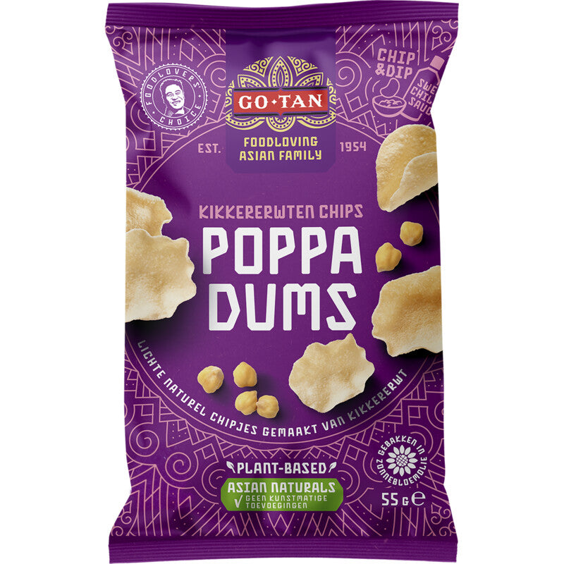 Knapperige chips van kikkererwten, heerlijk met Chilisaus. Vrij van kunstmatige toevoegingen. Asian naturals Gebakken in zonnebloemolie Vegetarisch Lekkere snack hallo, wij zijn go-tan. Geen merk zoals je gewend bent, maar een foodloving family uit azie. Go-Tan is een echt familiebedrijf dat met liefde en toewijding wordt geleid door bing en han go, de zoons van de oprichter. 'lekker eten speelt een sleutelrol binnen de familie. Het is de Manier om samen mooie herinneringen te maken. Daarom sluiten we nooit compromissen op smaak. Want eten is liefde. Let food do the talking, zeggen we als familie.