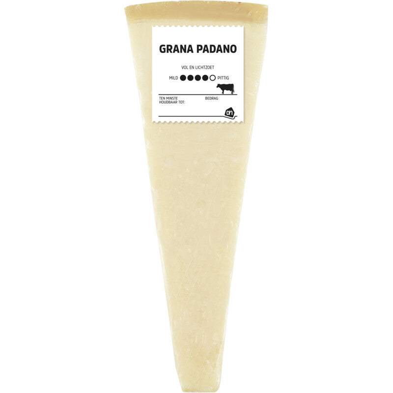 Grana Padano is een harde Italiaanse kaas deels gemaakt van magere koemelk. Grana Padano lijkt veel op de Parmigiano Reggiano, maar is een stuk jonger, milder van smaak en minder kruimelig van structuur. Smaak: Vol en lichtzoet Herkomst: Italië Gemaakt van: Rauwe koemelk. Grana Padano is ideaal als ingrediënt van (Italiaanse) gerechten. De kaas smelt goed en daarom goed te gebruiken in warme gerechten zoals risotto, pizza’s, pasta’s, ovenschotels en hartige taarten.