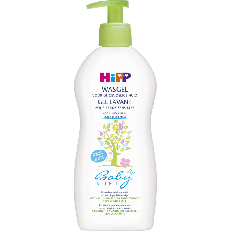 HiPP Wasgel voor huid en haar. Voor een bijzonder milde reiniging van het hele lichaam, behoudt de natuurlijke zuurgraad van de huid. met natuurlijke biologische amandelolie Zeepvrij bewezen zeer goed getolereerd door de zeer gevoelige huid bewezen zeer goed getolereerd door huid neigend naar dermatitis HiPP wasgel reinigt de gevoelige huid en is bijzonder zacht voor fijn haar en behoud de natuurlijke zure beschermlaag van de huid. Ideaal voor het hele gezin. Dermatologische getest. Geschikt voor de zeer gevoelige huid en de huid neigend naar dermatitis.