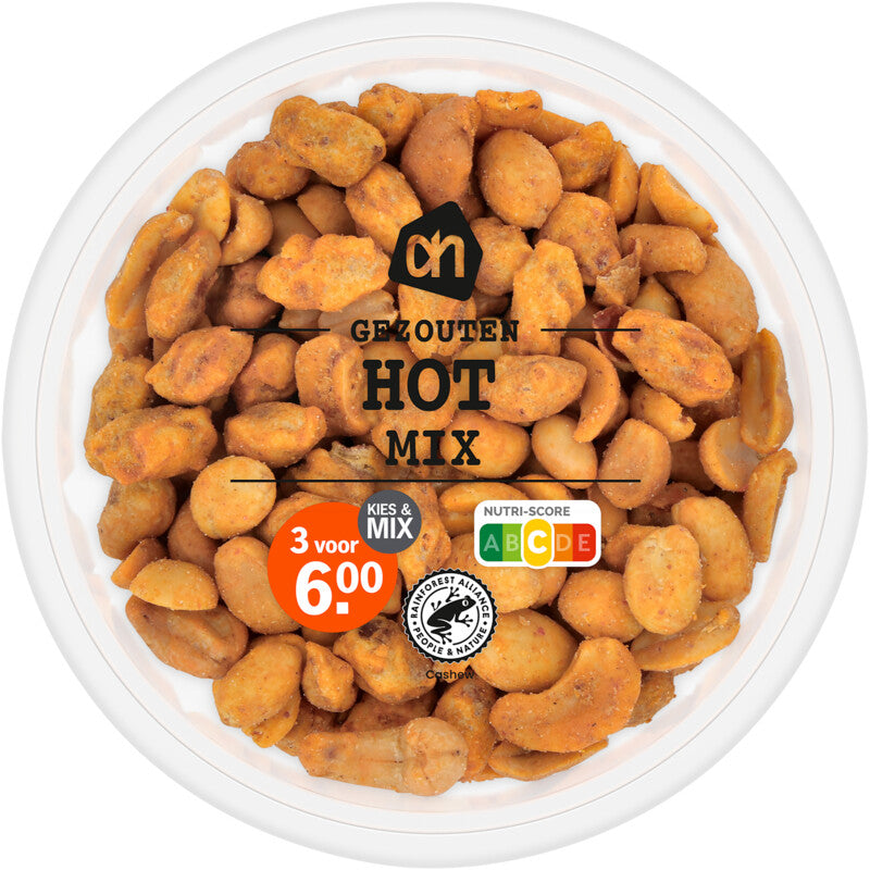 Ingrediënten: 64% pinda, 19% cashewnoot°, bloem (tarwe, maïs), zonnebloemolie, zetmeel (maïs, aardappel), zout, suiker, specerijen (o.a. 0,09% chili, 0,05% cayenne), dextrose, gistextract, maltodextrine, vrije-uitloopeipoeder, kleurstof (paprika-extract [E160c]), sojaboon, garnalenpoeder, natuurlijk aroma, voedingszuur (citroenzuur [E330]), capsicumextract.