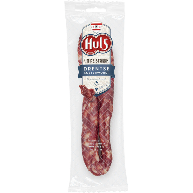 Huls kosterworst is een originele droge worst, bereid volgens oud drents recept. Door de natuurlijke droging en neutrale kruiding heeft deze worst een karakteristiek uiterlijk en een zuivere smaak. Met een heerlijk mengsel van verschillende kruiden Lekker als tussendoortje, snack of bij de borrel