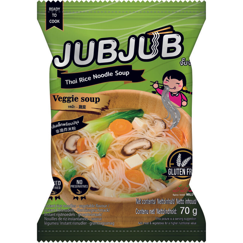 Geniet van de glutenvrije jubjub groente rijstnoedels! Laag in calorieen en zonder conserveermiddelen. Gedroogd met hete lucht voor een gezonde, vetarme maaltijd vol smaak!Glutenvrij genieten van instant rijstnoedelsLaag in calorieen dankzij het gebruik van rijstnoedelsProef de authentieke smaken van ThailandZonder toegevoegde conserveermiddelen