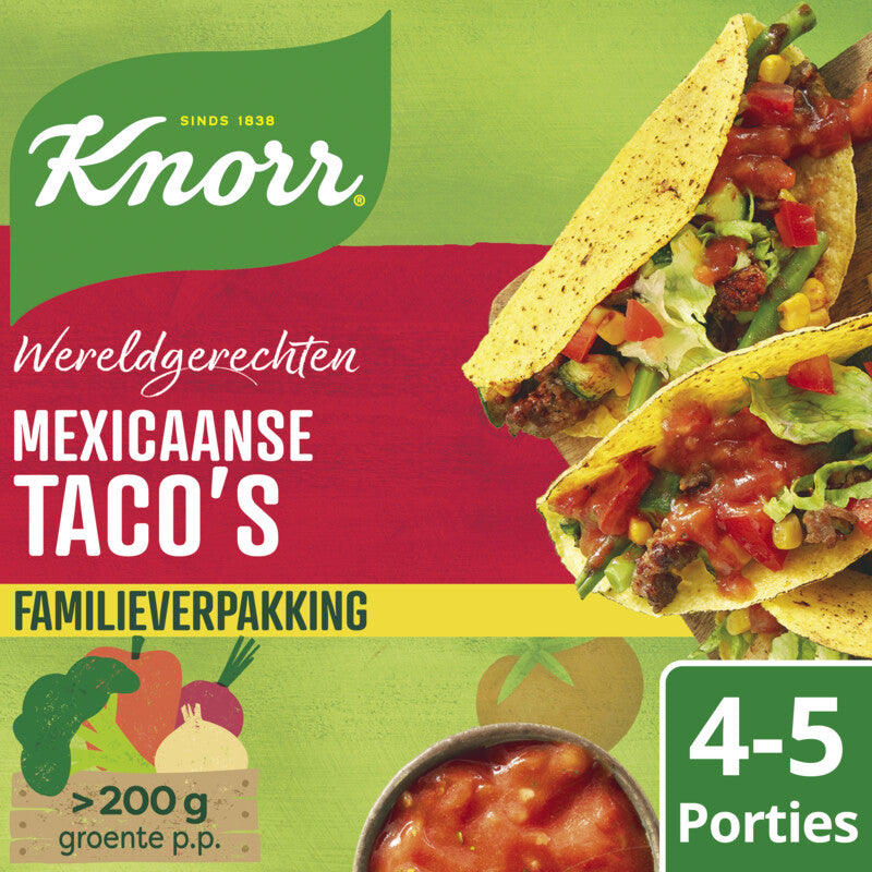 Met het Knorr taco's XXL wereldgerecht maaltijdpakket tover je binnen een handomdraai een heerlijke maaltijd met lekker veel groente op tafel. In een handomdraai een heerlijke maaltijd Authentieke Mexicaanse smaak Benodigdheden: 375 g mager rundergehakt, 2 courgettes 3 tomaten, 200 g mais (blik), 150 g ijsbergsla