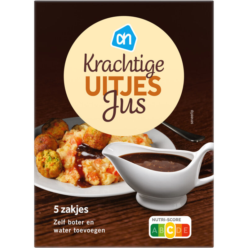 Ingrediënten: aardappelzetmeel, 19% uiengranulaat, gehydrolyseerd soja-eiwit, tarwebloem, zout, suiker, palmvet, tomatenpoeder, kleurstof (ammoniakkaramel E150c), natuurlijk aroma, maltodextrine, 1,1% uienpoeder, kaliumchloride (dieetzout), zonnebloemolie, emulgator (lecithinen [E322]).