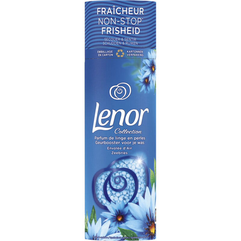 Ontdek de geurbooster voor je was van Lenor voor tot 12 weken langdurige frisheid in je kledingkast. Een boost van non-stop frisheid voor je wasgoed tot 12 weken Geurbooster met een schone geur die is samengesteld uit geurharmonieen Pas de geurintensiteit aan door zelf de hoeveelheid geurbooster te kiezen Lenor geurbooster wordt geleverd in een kartonnen verpakking Lenor geeft je kleding de heerlijke geur van een zeebries. Deze verfrissende geur geeft je het gevoel dat je van een dagje aan zee aan het genieten bent. Een schone geur die is samengesteld uit geurharmonieen van groene kruiden en zeewater, zoals het water van de zee, bloemige lelietje-van-dale-accenten en bruisende citrus. Lenor geurboosters voor je was hebben voortaan een vochtbestendige, recyclebare kartonnen verpakking.