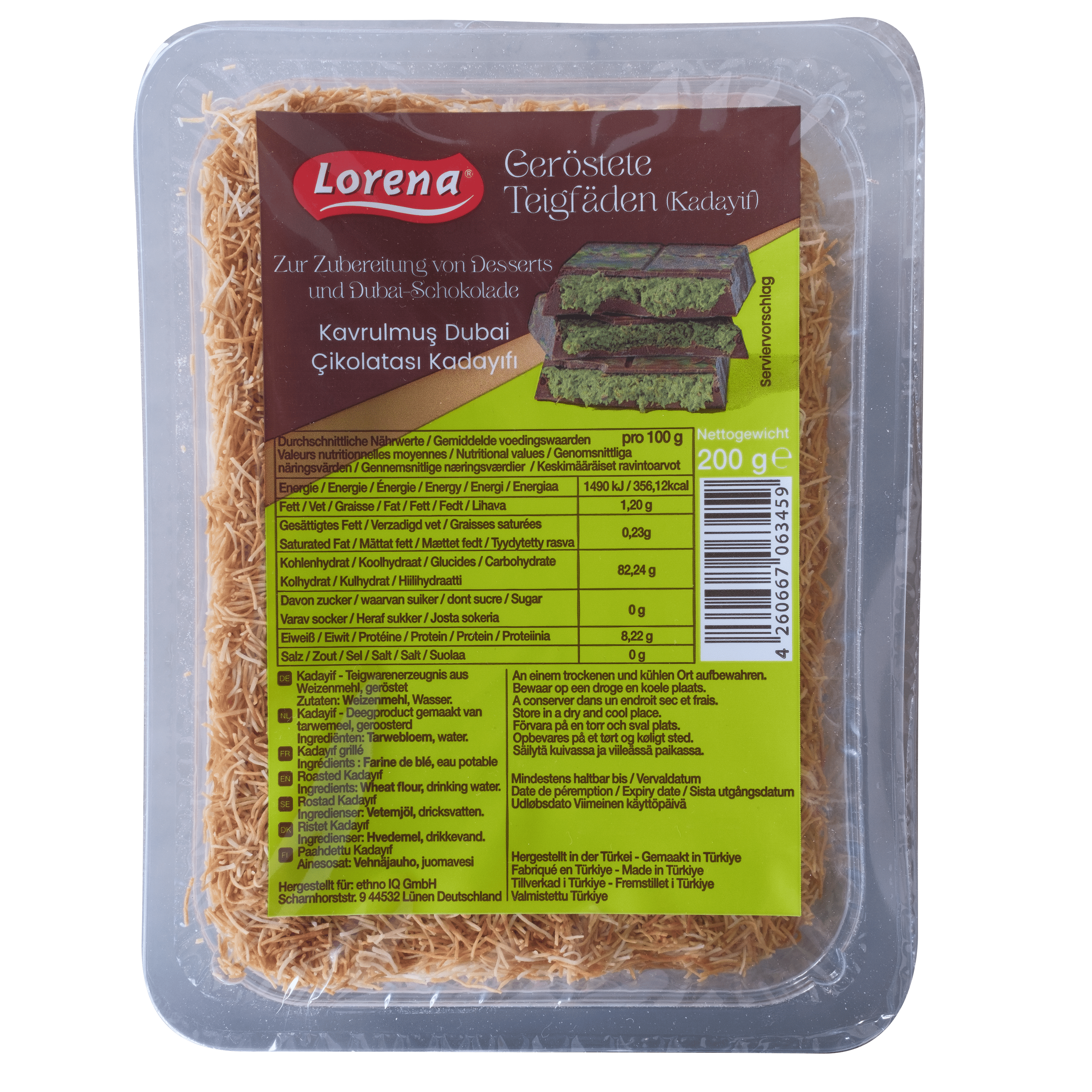 Het ingrediënt voor de Dubai reep! Dit product bevat kant-en-klaar, gebakken deeg dat perfect is om te mengen met pistachepasta.