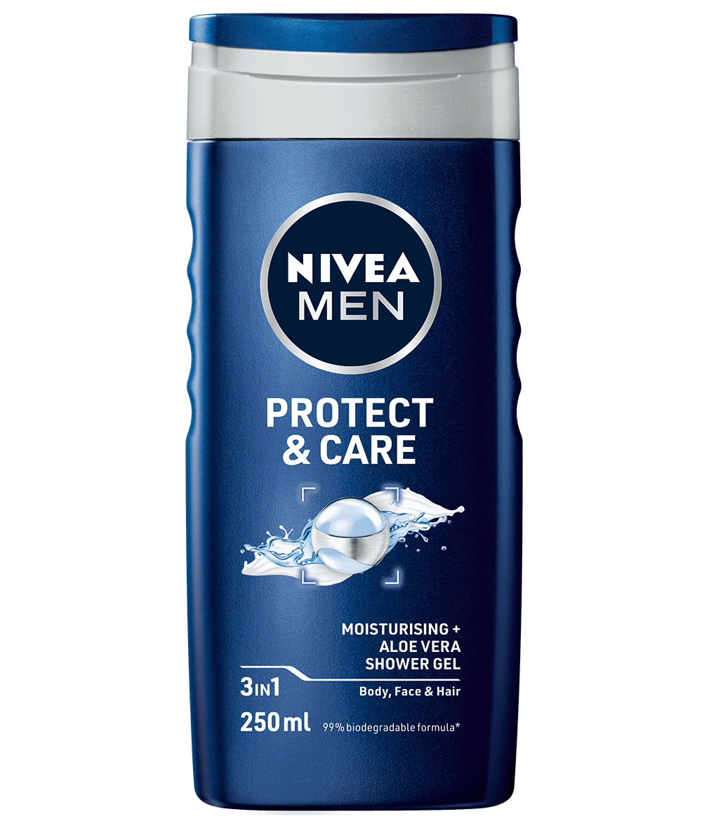 NIVEA MEN Protect & Care Showergel 250 ml voor mannen die op zoek zijn naar een schone en gehydrateerde huid na het douchen. De verzorgende formule met Aloë Vera helpt je huid te beschermen tegen uitdroging. Deze verfrissende 3-in-1 douchegel zorgt voor een gehydrateerde en gezond uitziende huid. pH Huidneutraal en huidvriendelijkheid dermatologisch goedgekeurd.