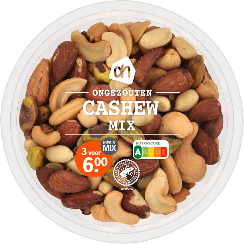 Ingrediënten: 34% cashewnoot°, 32% amandel, 16% pinda, 15% pistachenoot, zonnebloemolie.