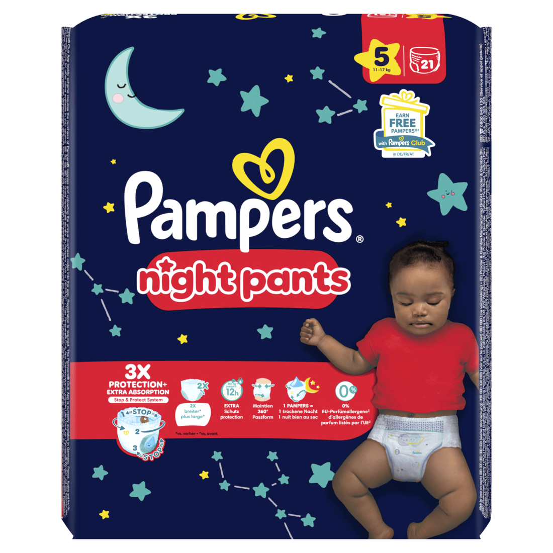 Geef je baby Pampers beste bescherming 's nachts met Pampers Night Pants: door hun superabsorberende kern zijn ze het meest absorberende product van Pampers en bieden tot 100% lekvrije nachten! Ze hebben ook een 360° tailleband die zich aan de nachtelijke bewegingen van je baby aanpast en een Stop & Protect pocket die lekken aan de achterkant helpt voorkomen! Net als alle andere Pampers luierbroekjes zijn de Pampers Night Pants heel eenvoudig te verschonen, zelfs als je baby veel beweegt: je trekt ze in één beweging aan, scheurt de zijkanten open om ze uit te trekken, rolt ze op en gebruikt de plakstrip om ze weg te gooien. Net zoals bij jou, komt jouw baby’s veiligheid bij Pampers op de eerste plaats: Pampers Night Pants zijn dermatologisch getest en bevatten 0% EU-parfumallergenen (zoals gereglementeerd in de EU-regelgeving voor cosmetica (EC) No 1223/2009). Ze zijn getest en Standard 100 gecertificeerd door OEKO-TEX. Wil je weten wat de bestanddelen zijn van onze producten? Bezoek Pampers.nl