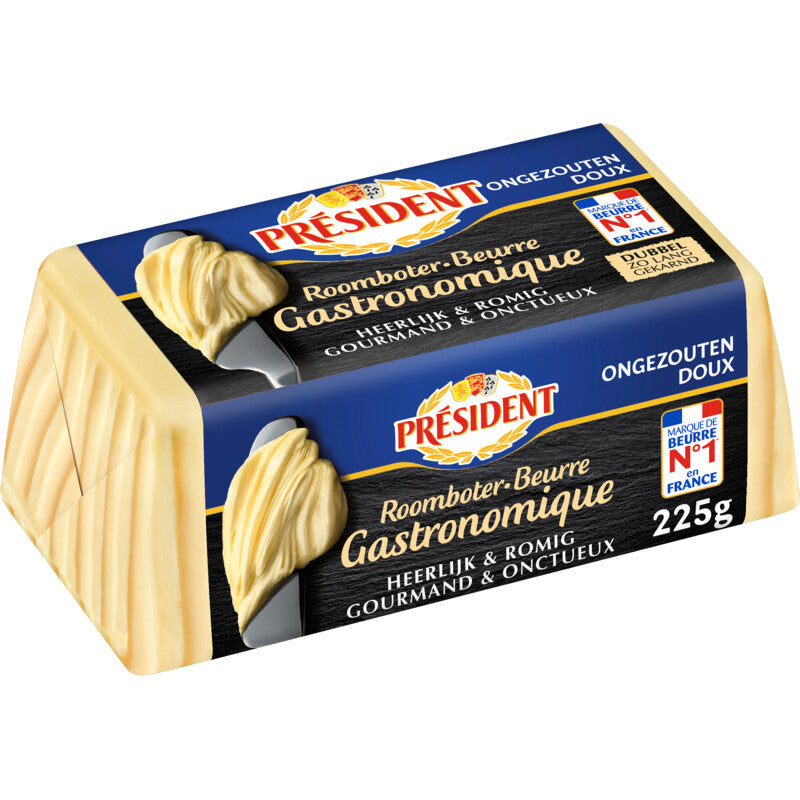 Deze Premium ongezouten roomboter van President is zo heerlijk en romig dankzij het karnen dat dubbel zo lang duurt als bij gewone roomboter.President is het nummer 1 botermerk in FrankrijkVoor koken en bakken, maar ook geschikt voor op brood en toast100% natuurlijk, zonder kunstmatige conserveermiddelen en kleurstoffenGekarnde boter