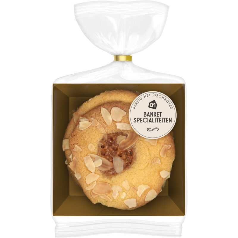 Lekkere roomboterkoeken met een hart van karamel en bestrooid met stukjes amandel. Krokante vanille koek bereid met 100% roomboter In luxe verpakking Op plaat gebakken Altijd handig om in huis te hebben!