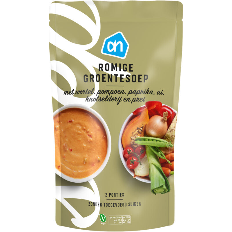 Romige groentesoep DIT PRODUCT BEVAT VAN NATURE AANWEZIGE SUIKERS. Verwarm de soep al roerende in een pan of magnetron (600 Watt) gedurende 6 minuten. Romige groentesoep met wortel, pompoen, paprika, ui, knolselderij en prei. 2 porties. Onze koks hebben een smakelijke maaltijd samengesteld, jij hoeft alleen op te warmen en te genieten.