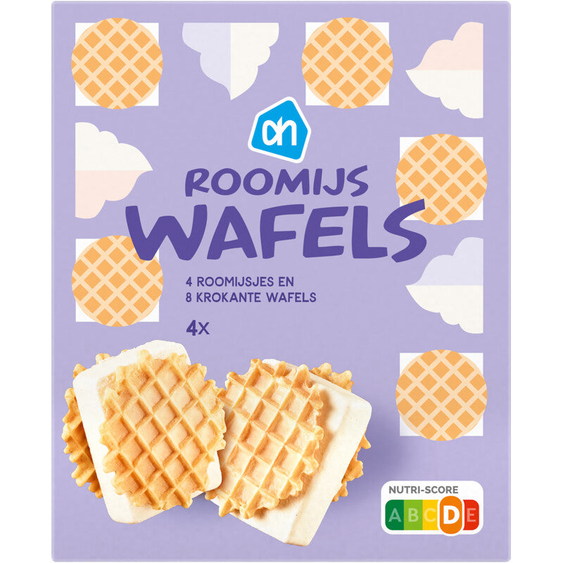 Roomijswafels met heerlijk zacht vanille roomijs en een zakje krokante wafels. 4 roomijsjes 8 krokante wafels Leuk om uit te delen