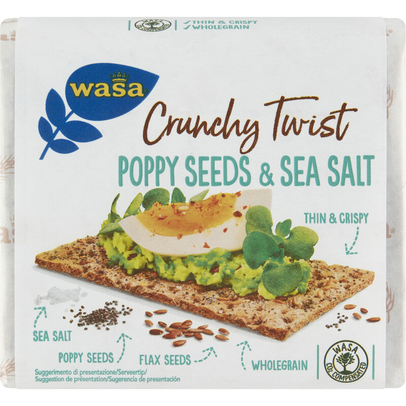 Wasa crunchy twist is een dun en extra knapperig knackebrod van volkoren roggemeel en rijkelijk belegd met voedzame zaden en een snufje zeezout. Dun en krokant Gebakken met volkoren roggemeel en rijk aan vezels Met lijnzaad, maanzaad en zeezout Lekker als ontbijt en lunch met je favoriete topping of gewoon tussendoor Wasa crunchy twist wordt net als onze andere producten 100% co2-gecompenseerd geproduceerd.