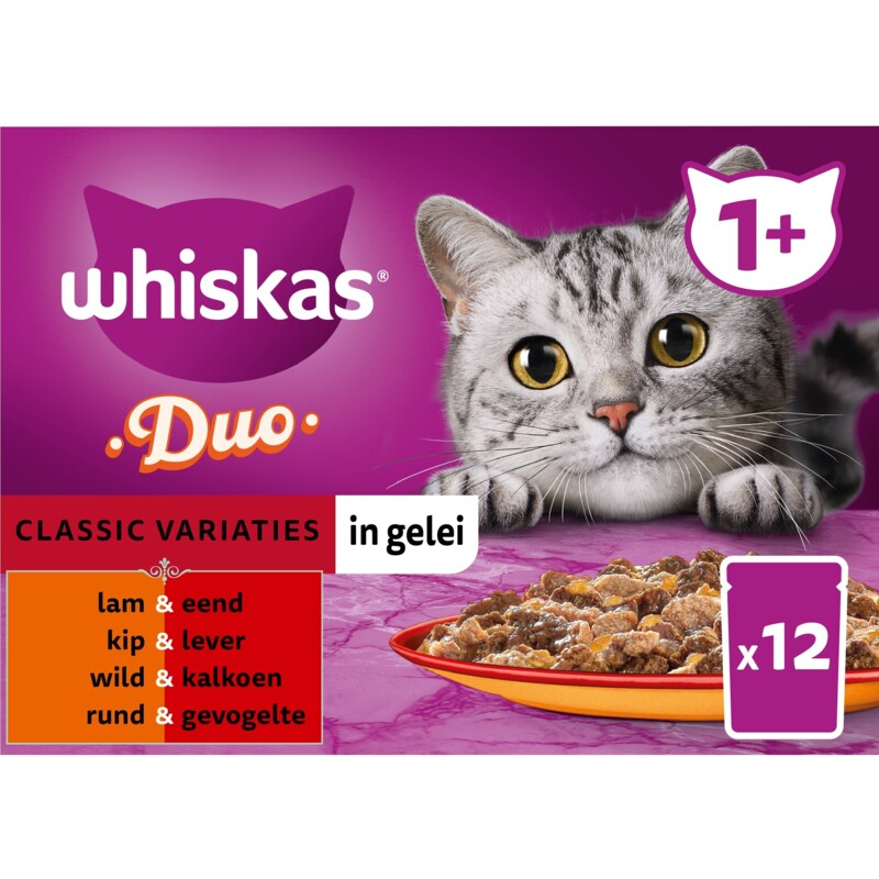Verras je kat met onze heerlijke duo classic variaties recepten in gelei met twee soorten vlees in iedere maaltijd voor een waanzinnige smaaksensatie die geen kat kan weerstaan! 100% van de dagelijkse behoeften van je kat Inclusief vitamine b en d en een gebalanceerde mix van mineralen Doos is 100% recyclebaar en bevat gerecycled papier
