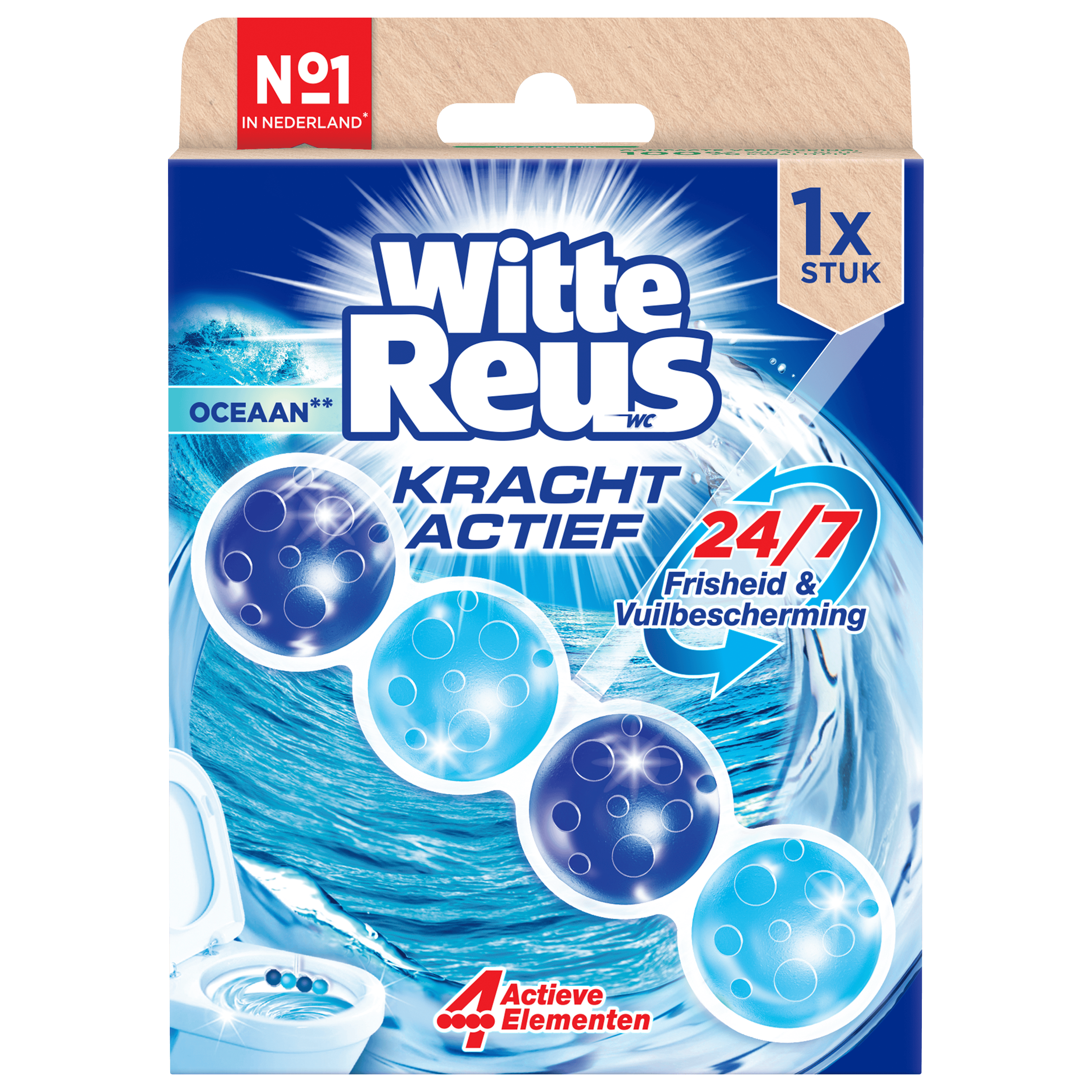 Op zoek naar een makkelijke manier om uw toilet schoon en fris te houden? Het Witte Reus kracht actief oceaan wc-blok zorgt voor een schoon en fris toilet van de eerste tot de laatste spoelbeurt. Het Witte Reus kracht actief toiletblok bestaat uit een formule met vier functies: het reinigend schuim zorgt ervoor dat uw toilet bij elke spoelbeurt krachtig gereinigd wordt. Dankzij de anti-kalk formule wordt kalkaanslag in het toilet voorkomen. Het Witte Reus kracht actief oceaan toiletblok bevat een vuilbeschermer, die de vorming van vuil tussen de schoonmaakbeurten door voorkomt. Een frisse oceaangeur zal worden verspreid, dankzij het luchtverfrissereffect, van de eerste tot de laatste spoelbeurt. Zo krijg je een heerlijk fris toilet! Duurzaamheid: het karton en de houder zijn 100% recyclebaar. Probeer ook de frisse geur van de andere Witte Reus kracht actief toiletblok varianten!
