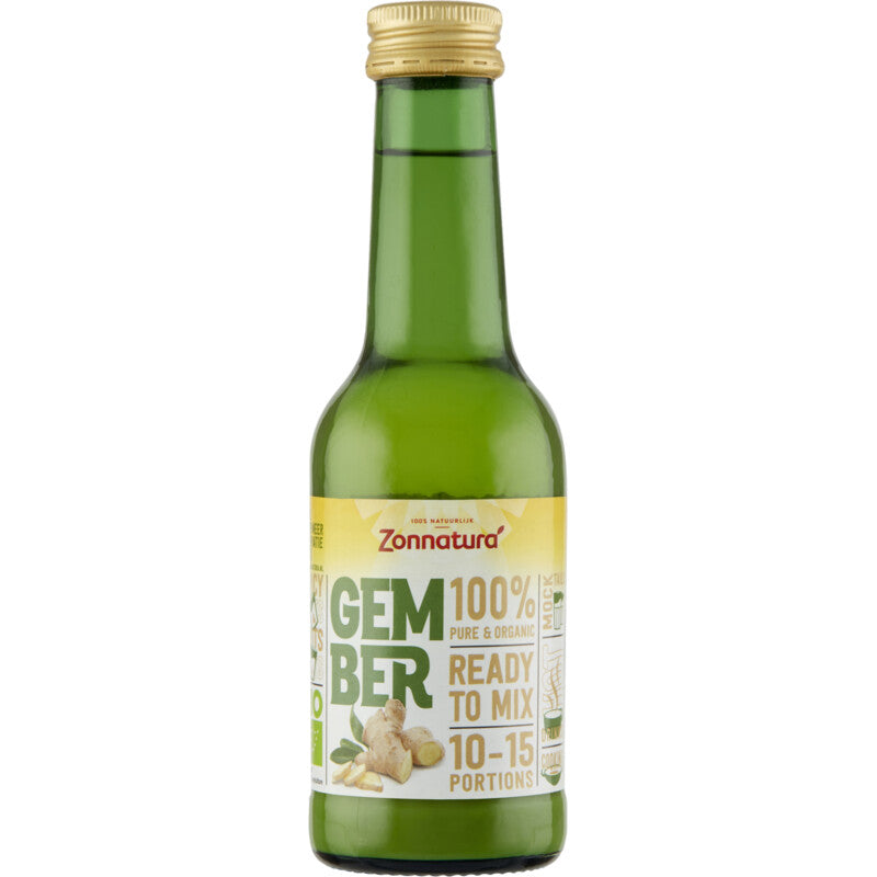 Zonnatura puur gembersap, 100% gember zonder toevoegingen, ready to mix. Geen gedoe, meer met raspen. Ideaal voor je gemberthee, je mocktail, je eigen gembershot of je favoriete wokgerecht. Hoge kwaliteit gember Minimaal 10-15 porties per flesje Schudden voor gebruik